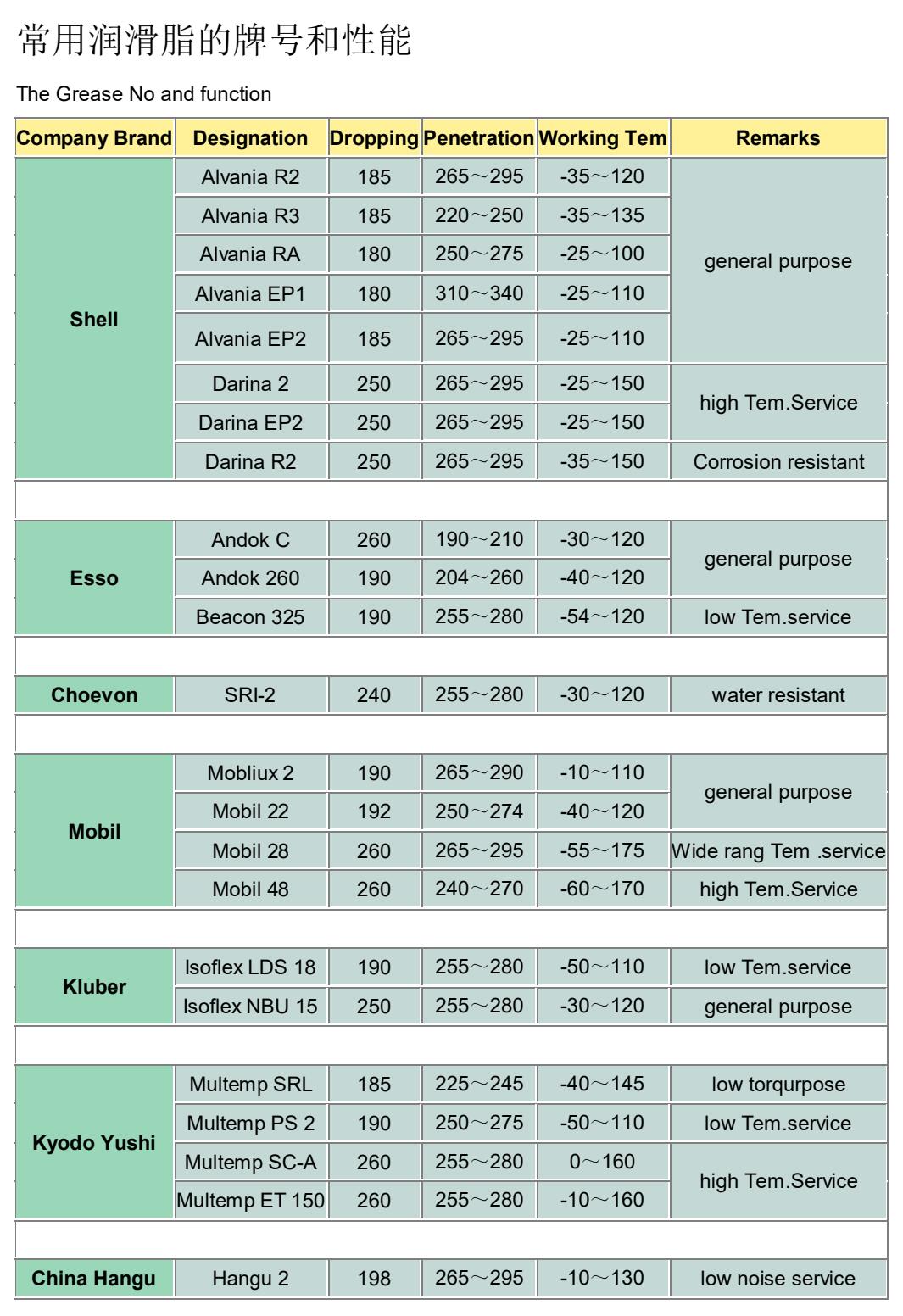 常用轴承润滑脂的牌号和性能
